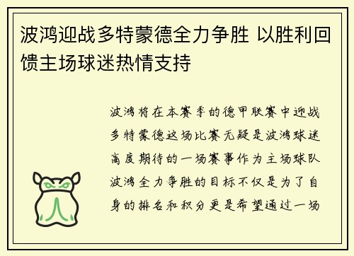 波鸿将在本赛季的德甲联赛中迎战多特蒙德,这场比赛无疑是波鸿球迷高度期待的一场赛事。作为主场球队,波鸿全力争胜的目标不仅是为了自身的排名和积分,更是希望通过一场胜利回馈热情的主场球迷。球迷的支持是球队的动力源泉,而胜利是对他们最好的回报。本文将从四个方面深入探讨波鸿迎战多特蒙德时,如何通过全力争胜回馈球迷的热情支持。首先,将分析波鸿球队的当前状态及其主场优势;其次,探讨波鸿与多特蒙德的历史对战记录及比赛的战术重点;然后,阐述球迷支持对波鸿士气的巨大作用;最后,分析胜利对波鸿未来发展的积极影响。通过这些方面的分析,全面展现波鸿全力争胜的动机和目标。