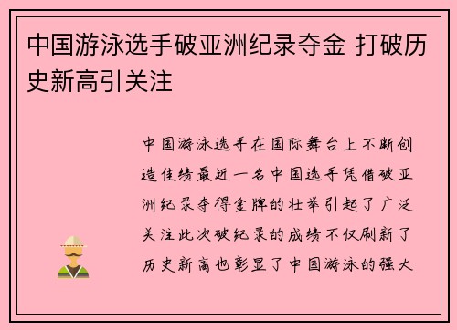 中国游泳选手在国际舞台上不断创造佳绩,最近,一名中国选手凭借破亚洲纪录、夺得金牌的壮举,引起了广泛关注。此次破纪录的成绩不仅刷新了历史新高,也彰显了中国游泳的强大实力和潜力。本文将从选手的背景、比赛过程、技术创新、社会影响等四个方面,详细分析这一令人瞩目的事件,探讨中国游泳在全球体育格局中的重要地位。