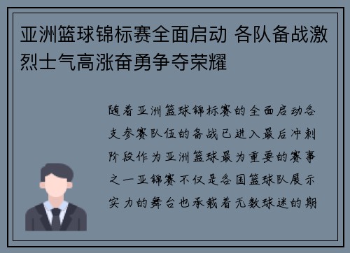 随着亚洲篮球锦标赛的全面启动,各支参赛队伍的备战已进入最后冲刺阶段。作为亚洲篮球最为重要的赛事之一,亚锦赛不仅是各国篮球队展示实力的舞台,也承载着无数球迷的期待与激情。各队的备战工作如火如荼,士气高涨,球员们纷纷表示将在比赛中拼尽全力,争取为国家赢得荣誉。本文将从四个方面对亚洲篮球锦标赛的启动以及各队备战情况进行详细分析,探讨备战的激烈程度、队伍的状态、关键球员的发挥以及赛事的影响力等方面,全面呈现这场篮球盛宴的盛况。