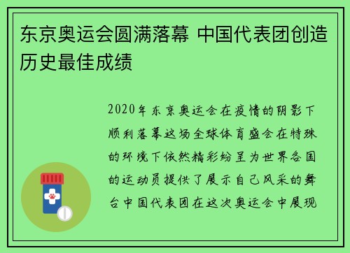 东京奥运会中国代表团创下的历史最佳成绩,标志着中国体育事业进入了新的发展阶段。从成绩的突破到重点项目的精彩表现,再到体育精神的充分体现和未来发展的远景展望,这些都为我们呈现了一个更加全面、更加多元的中国体育形象。无论是运动员的拼搏精神,还是整个代表团的协同合作,都在这次奥运会中展现得淋漓尽致。